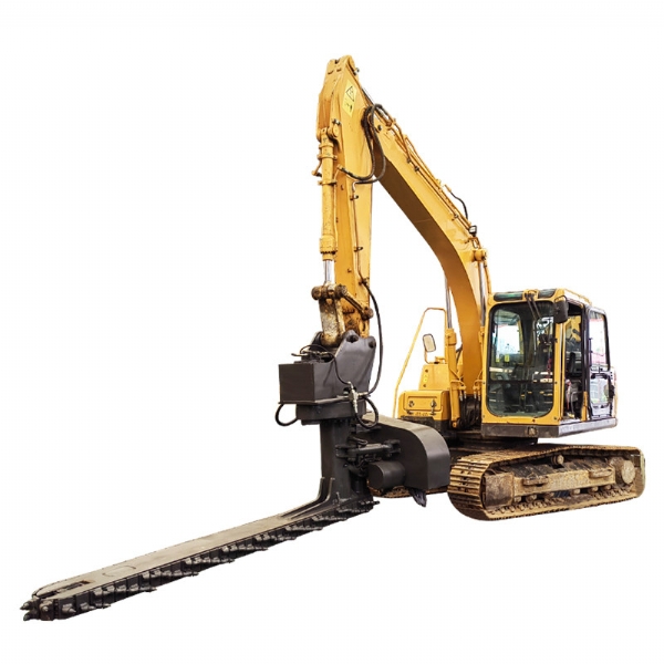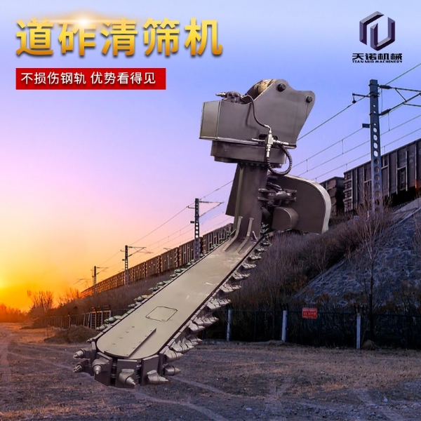 目前,鐵路交通發(fā)展迅速,對于年久的鐵路路基下面的石子需要定期更換,對于鐵路上的清渣機需要大型設備操作十分的不方面,采用人工又十分耗時,工作效率比較低下;為解決上述問題,克服現(xiàn)有技術的不足,天諾工程機械研發(fā)了一種能夠在狹小空間內(nèi)作業(yè)、操作簡單、效果高的鐵路清渣機;鐵路清渣機包含扒渣鏈部、清渣板部、安裝部和連接部,安裝部設置在扒渣鏈部的上部,其用于與挖掘機連接;清渣板部設置在扒渣鏈部的尾端,清渣板部和扒渣鏈部通過連接部相連;扒渣鏈部包括鏈條,鏈條由若干首尾相連的鏈節(jié)組成,鏈節(jié)包括支座和設置在支座上的截齒;若干截齒呈波浪式陣列布置;安裝部包括上座板和下座板,上座板和下座板之間設置有回轉支承,上座板上部設置有兩個相互平行的大耳板。鐵路清渣機是為鐵路道咋清理而設計的一款鐵路專用屬具,鏈條式道咋清理機需安裝在150挖掘機前端,并從軌道外側位置清理,通過大扭矩馬達帶動免維護鏈條上作業(yè)鏈條上裝置超耐磨的合金屬具對道床道砟進行連續(xù)清理的技術,排列使得道砟的清理及更換更加簡單高 效,提高了施工速度同時節(jié)省了勞動力。